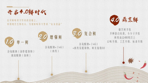东锦食品集团研发团队通过食材创新、工艺创新、设备创新的“三大创新”对鲜味产业进行了“四个升级”——即标准升级、工艺升级、鲜味升级、口感升级,开创了第四代鲜味4.0产业——鼎烹鲜时代,实现了鸡精行业世界级的领先水平。