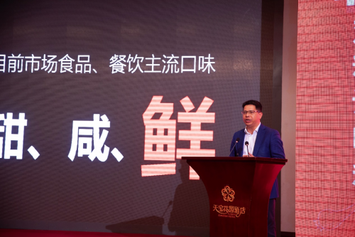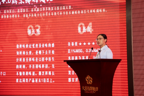 上海东锦集团食品有限公司新品研发系统技术总监蔡愈杭女士从专业的角度阐释了“鲜”科学和“鲜”产业,展示出“鼎烹世家4.0鸡精调味料”的首创性。